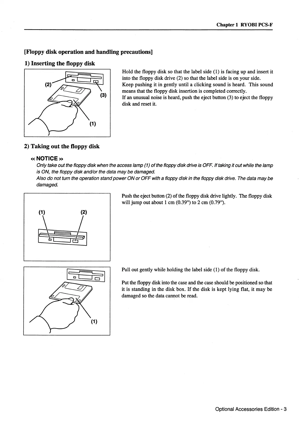 Hold the floppy disk so that the label side (1) is facing up and insert it