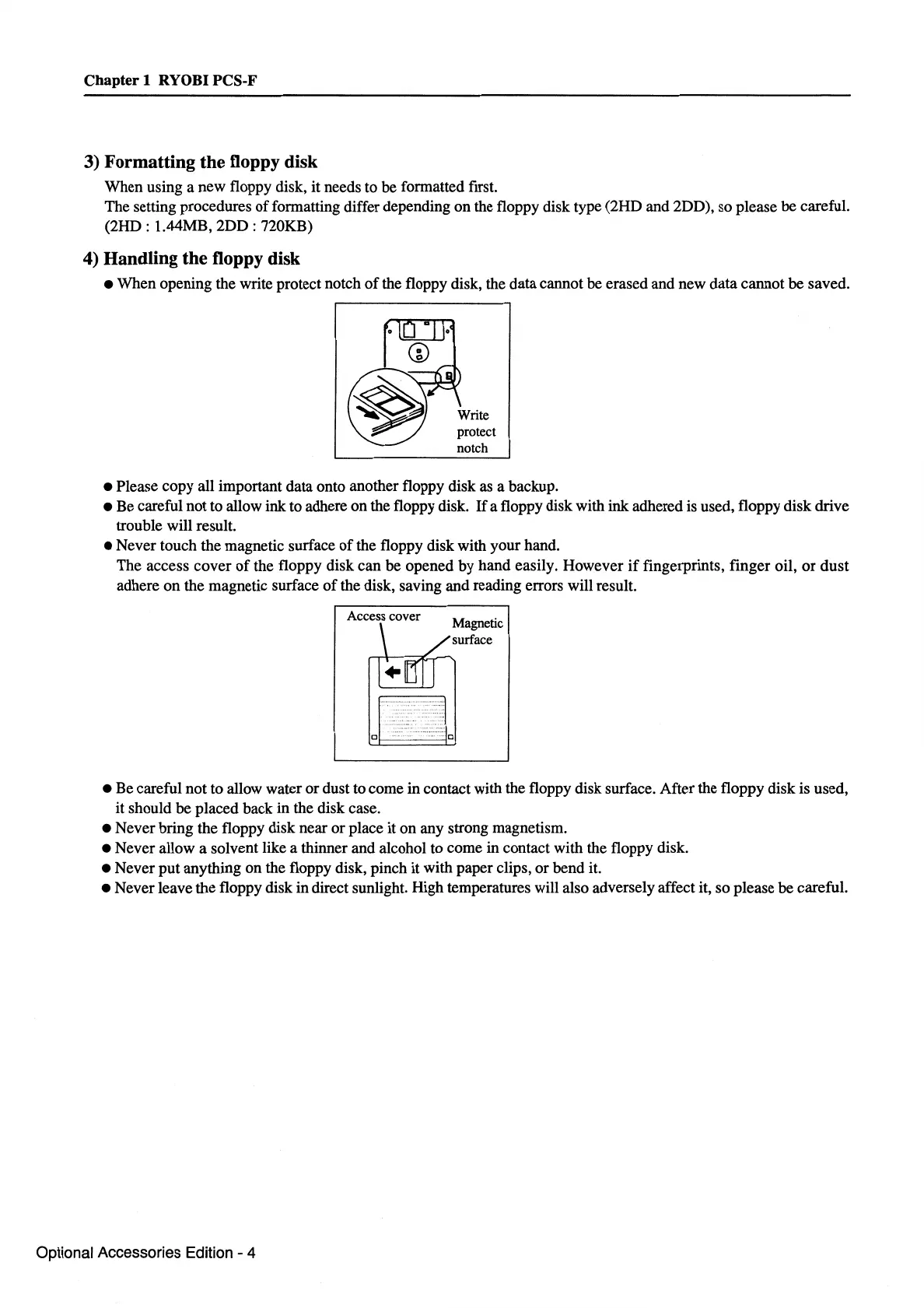 • Never allow a solvent like a thinner and alcohol to come in contact with the floppy disk.