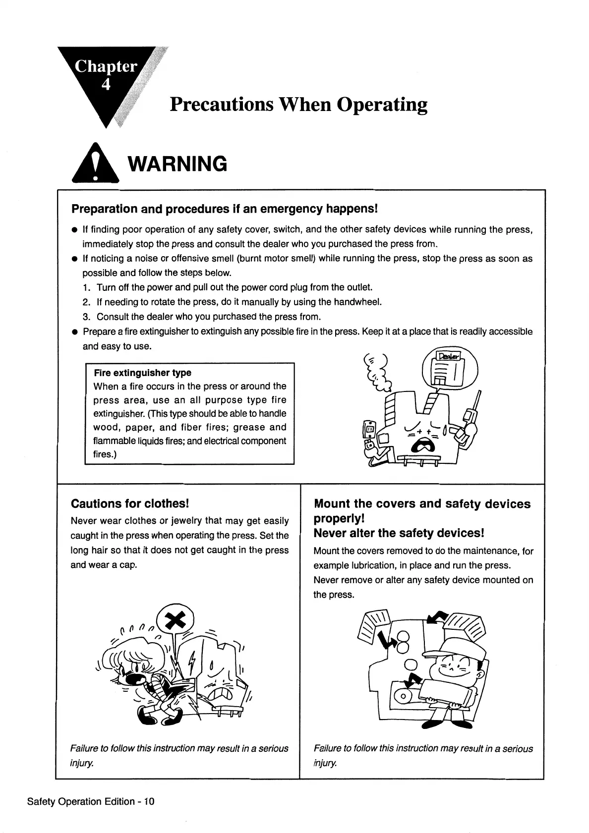 • If finding poor operation of any safety cover, switch, and the other safety devices while running the press,