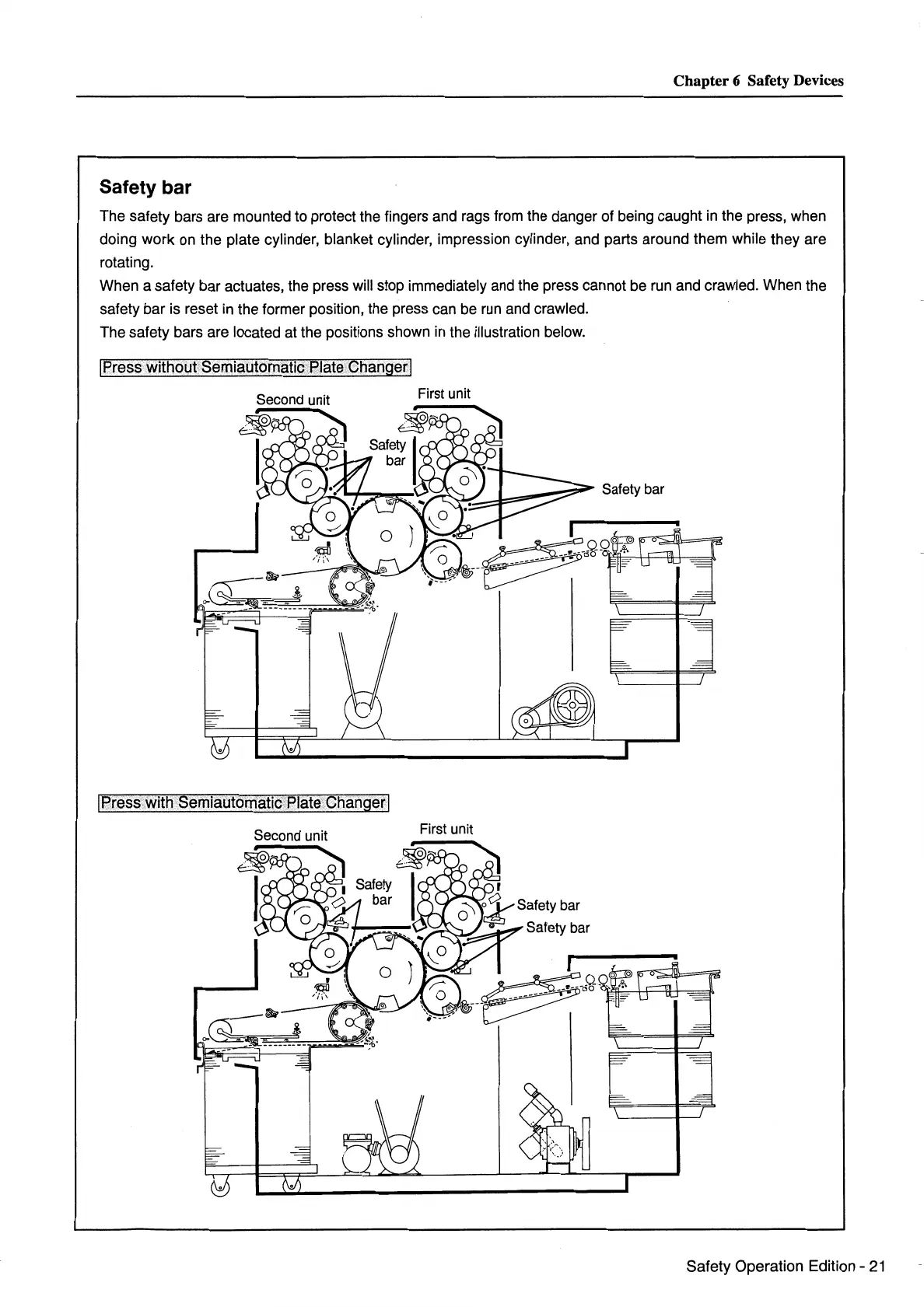 When a safety bar actuates, the press will stop immediately and the press cannot be run and crawled. When the