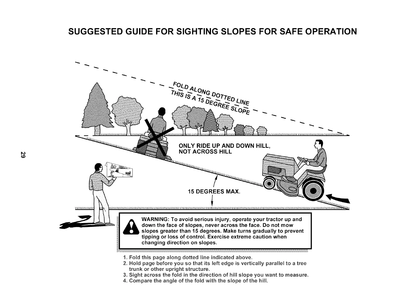 slopes greater than 15 degrees. Make turns gradually to prevent