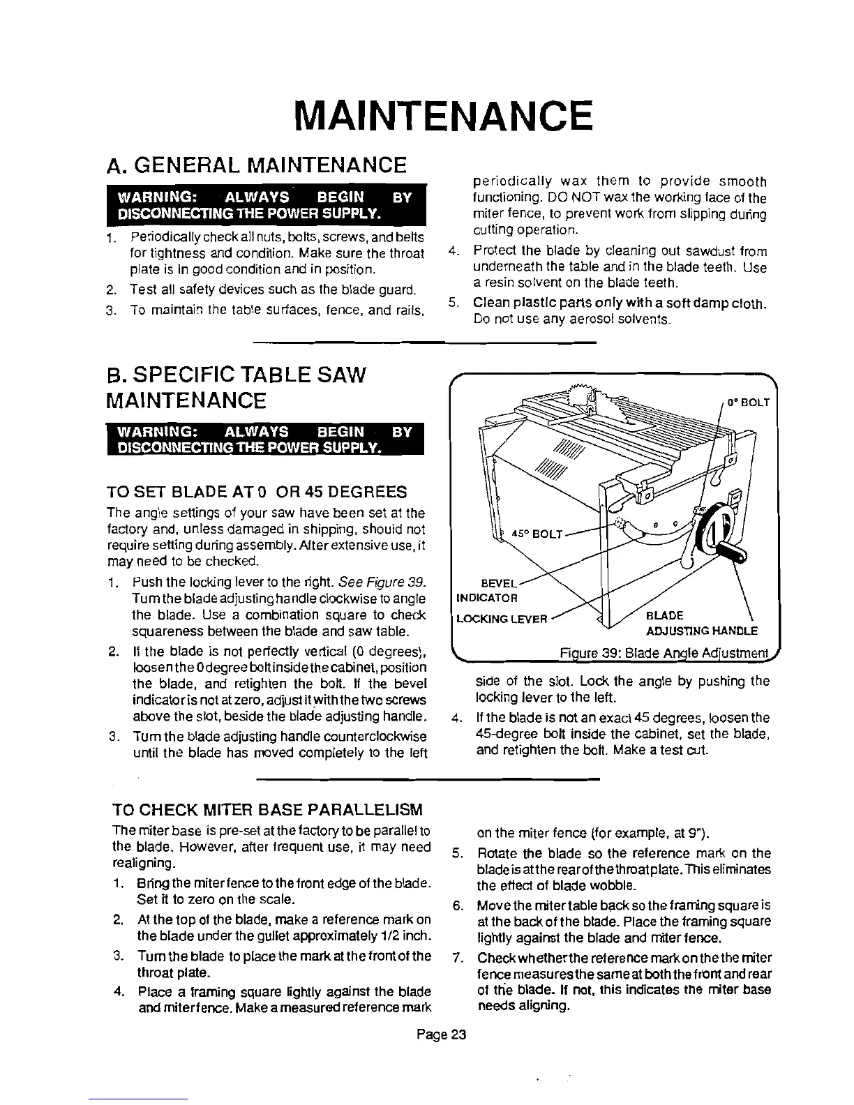 Ryobi BT-3000 - Maintenance; General Maintenance; Blade Angle and Base Alignment