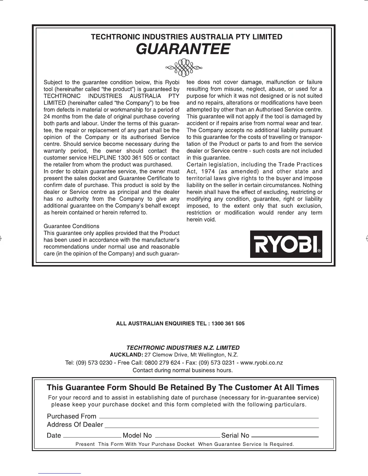 Tel: 61 3 9840 3226 Fax No.: 613 9840 6133 www.ryobi.com.au