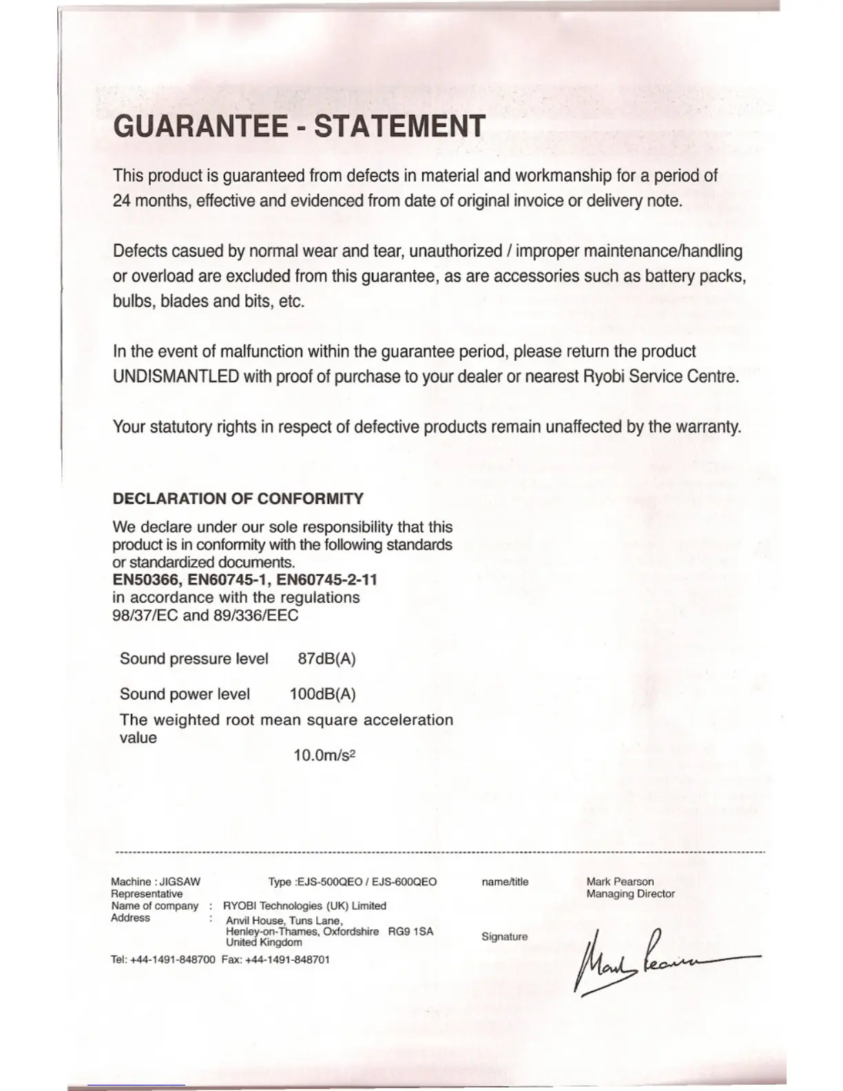 UNDISMANTLEDwithproofofpurchaseto yourdealerornearestRyobiServiceCentre.
