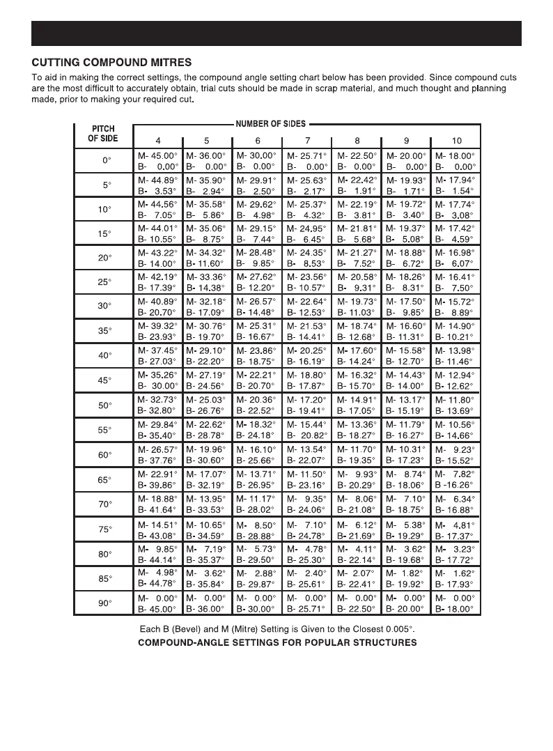 Ryobi EMS1825SCL - Cutting Reference Data; Compound Mitre Angle Chart