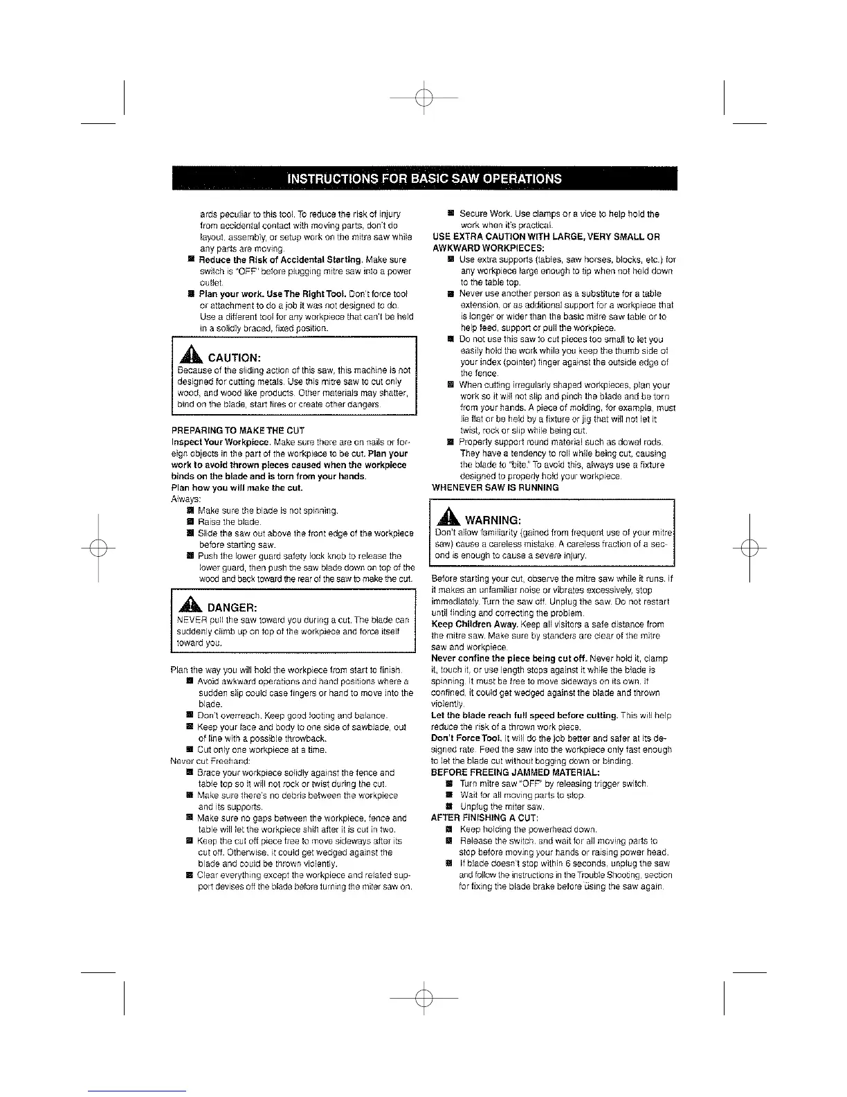 Ryobi EMS2305SCL - Basic Saw Operations and Safety; Injury Prevention During Operation; Cut Planning and Execution; Workpiece Handling and Support