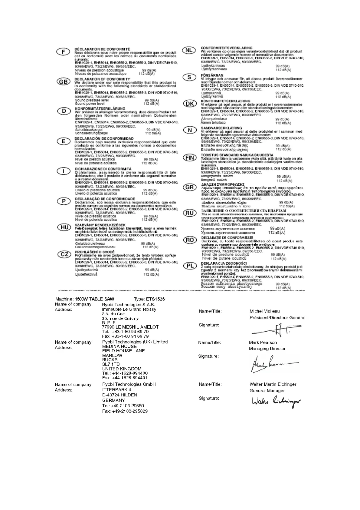 Ryobi ETS-1526 - Declaration of Conformity