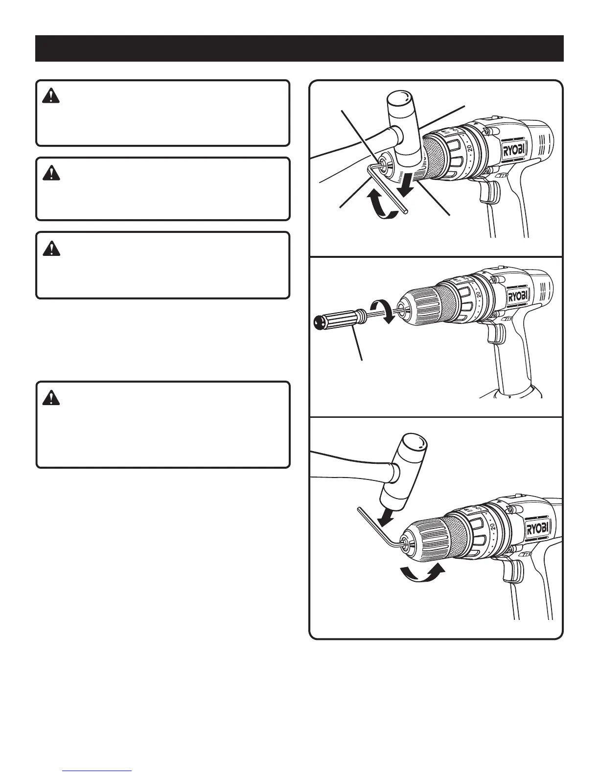 n Open the chuck jaws and remove the hex key wrench.