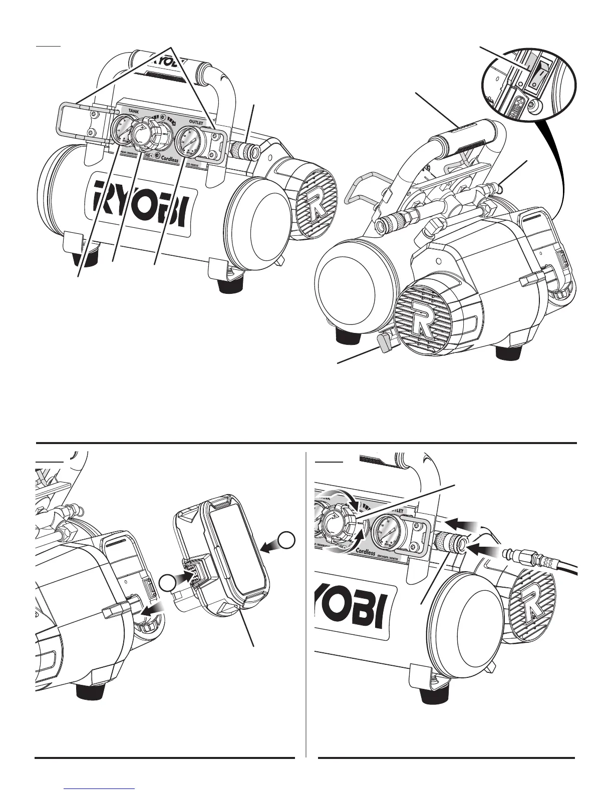 B - Depress latches to release battery pack (appuyer sur le loquet pour