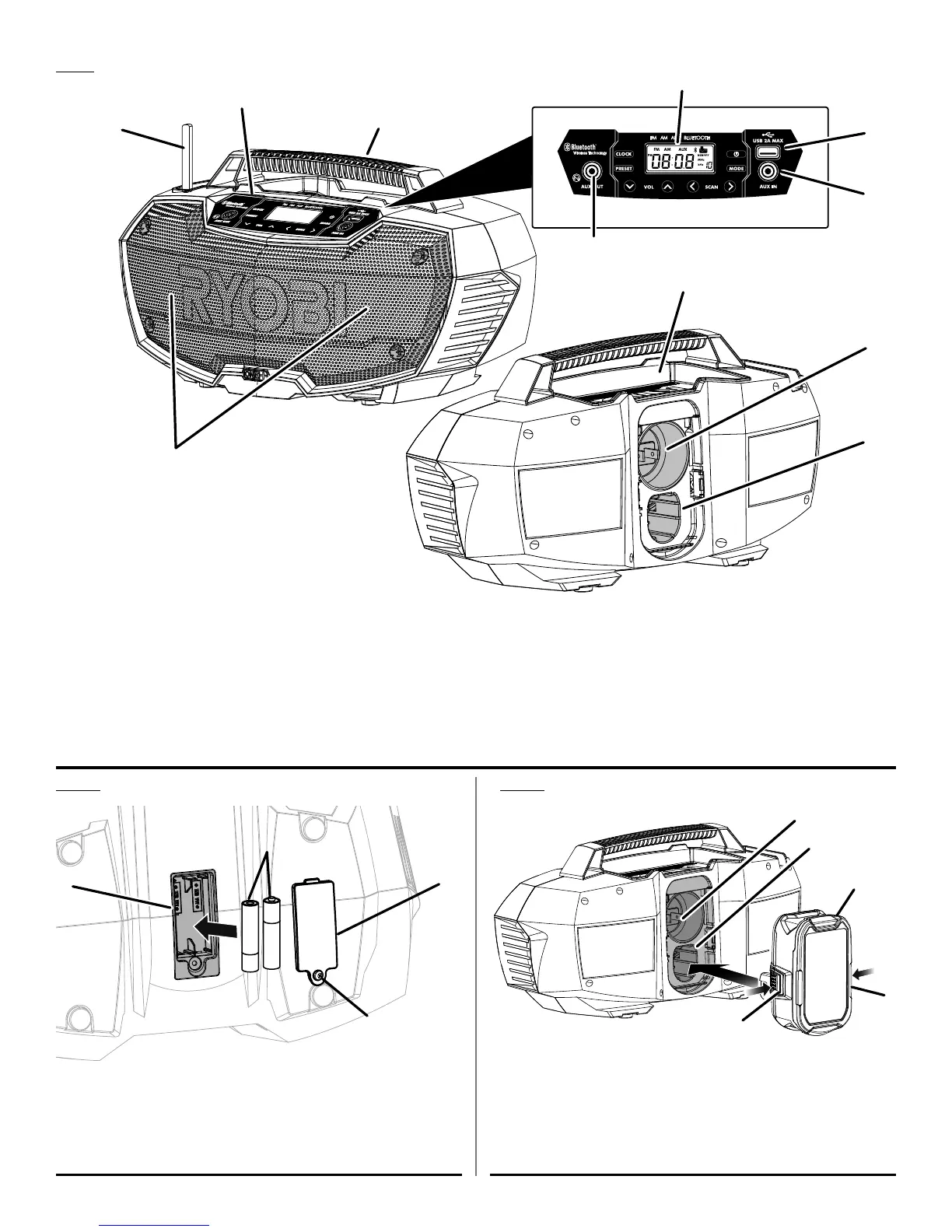 B - Battery port (compartiment de la pile, receptáculo para baterías)