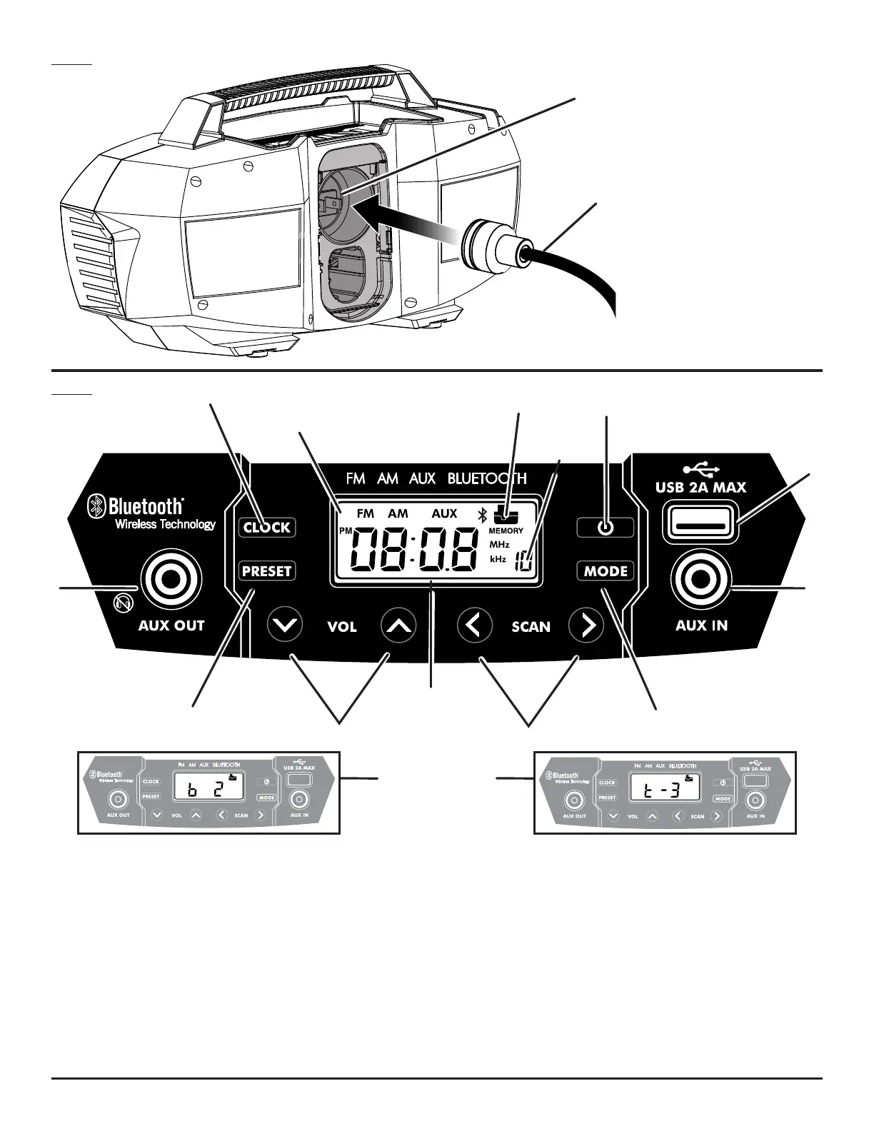 B - Mode selection display (affichage de sélection du mode, pantalla de