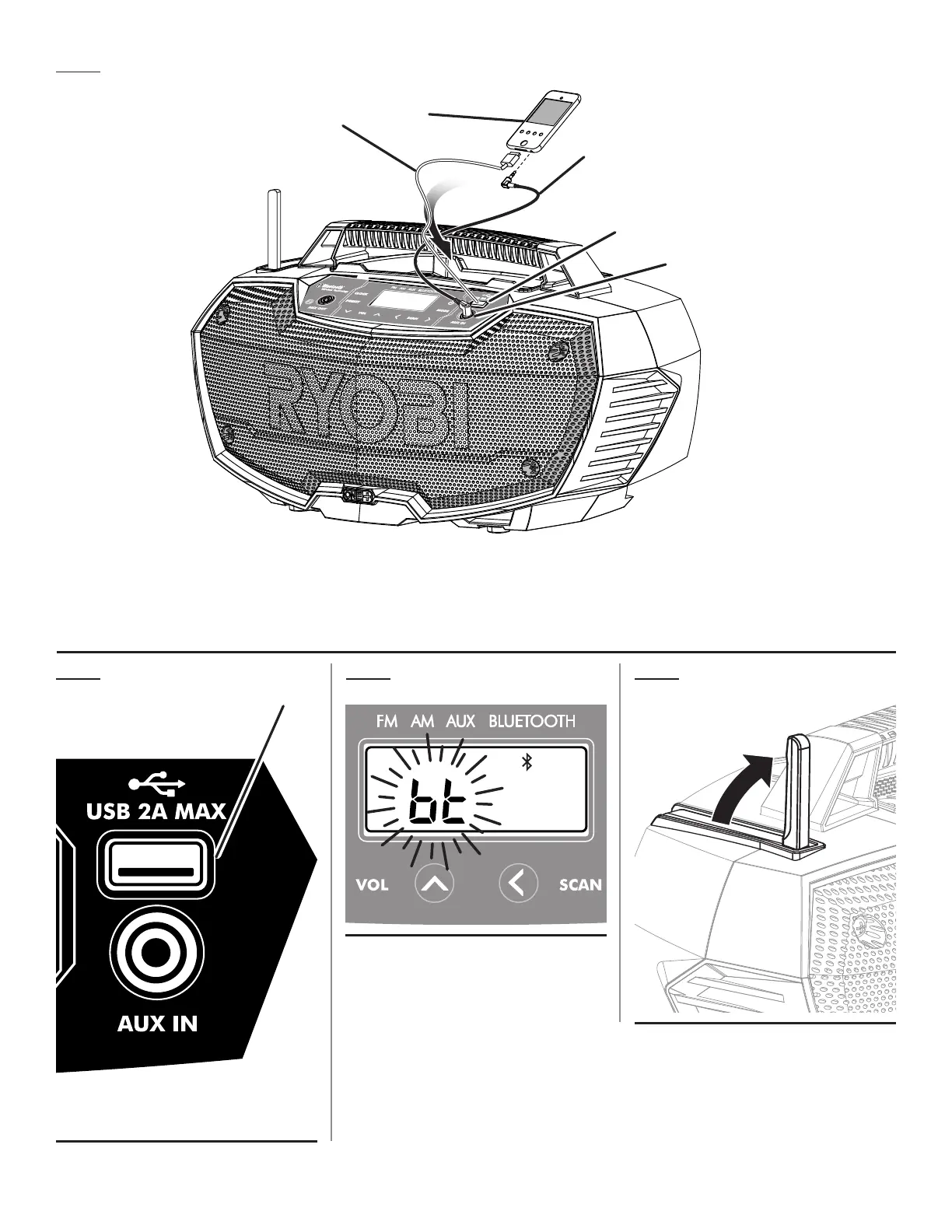 D - Auxiliary input port (connecteur d'entrée auxiliaire, enchufe de entrada auxiliar)