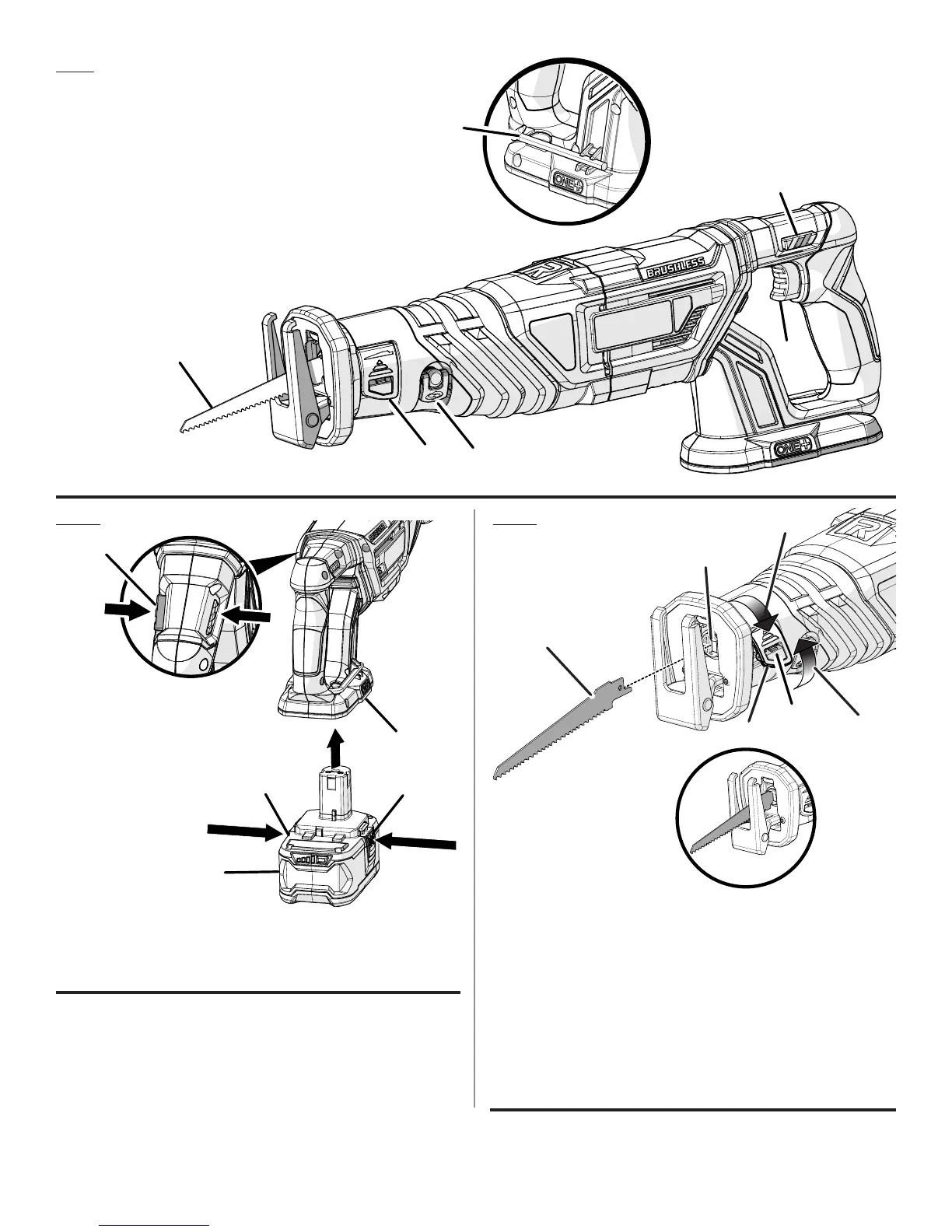 B - Blade clamp lock/release lever (levier verrouillage/déverrouillage de
