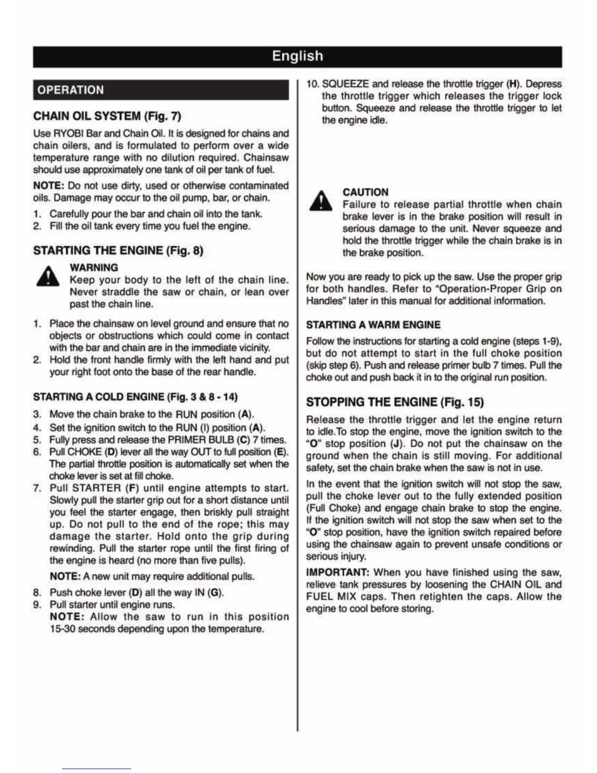 Ryobi PCN 4040 - Operation: Starting and Stopping; Starting the Engine; Stopping the Engine
