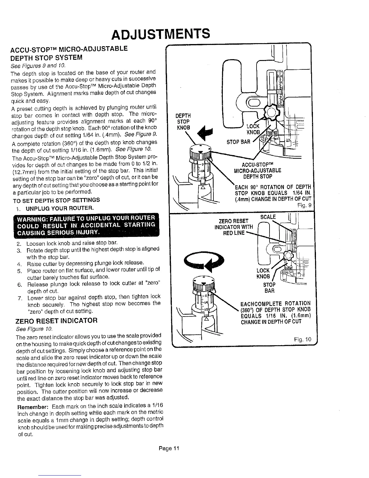 Ryobi R175 - Accu-Stop Micro-Adjustable Depth Stop System; To Set Depth Stop Settings; Indicator of Re-Setting Zero