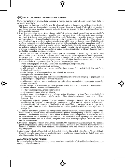 4. Za potrebe servisiranja, proizvod se mora poslati ili odnijeti u ovlaštenu servisnu postaju tvrtke RYOBI