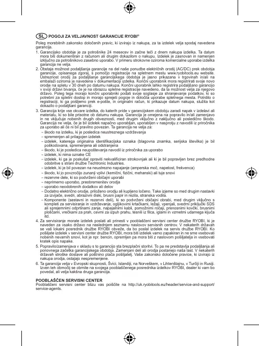 POGOJI ZA VELJAVNOST GARANCIJE RYOBI