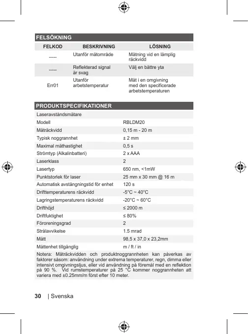 Punktstorlek för laser 25 mm x 30 mm @ 16 m
