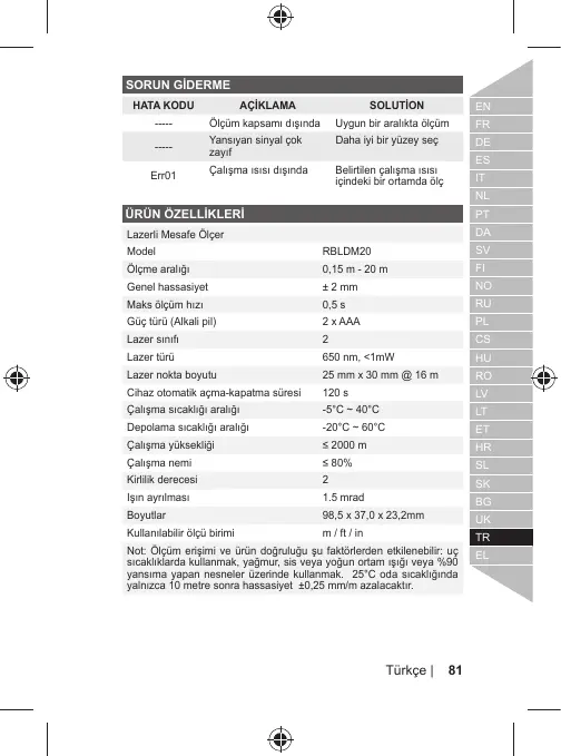 Lazer türü 650 nm, <1mW