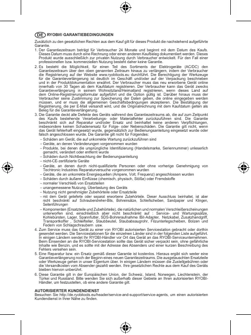 die Registrierung auf der Website www.ryobitools.eu durchführt. Die Berechtigung der Werkzeuge