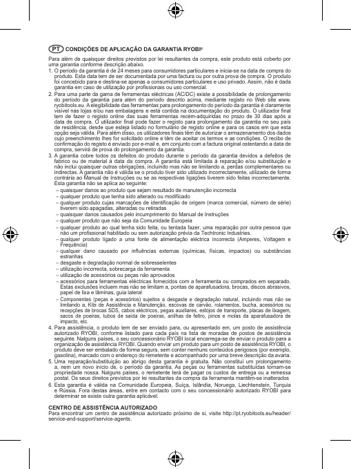 ryobitools.eu. A elegibilidade das ferramentas para prolongamento do período da garantia é claramente