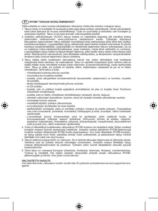 pidemmäksi verkkosivuston www.ryobitools.eu rekisteröinnin kautta. Työkalujen kelpoisuus