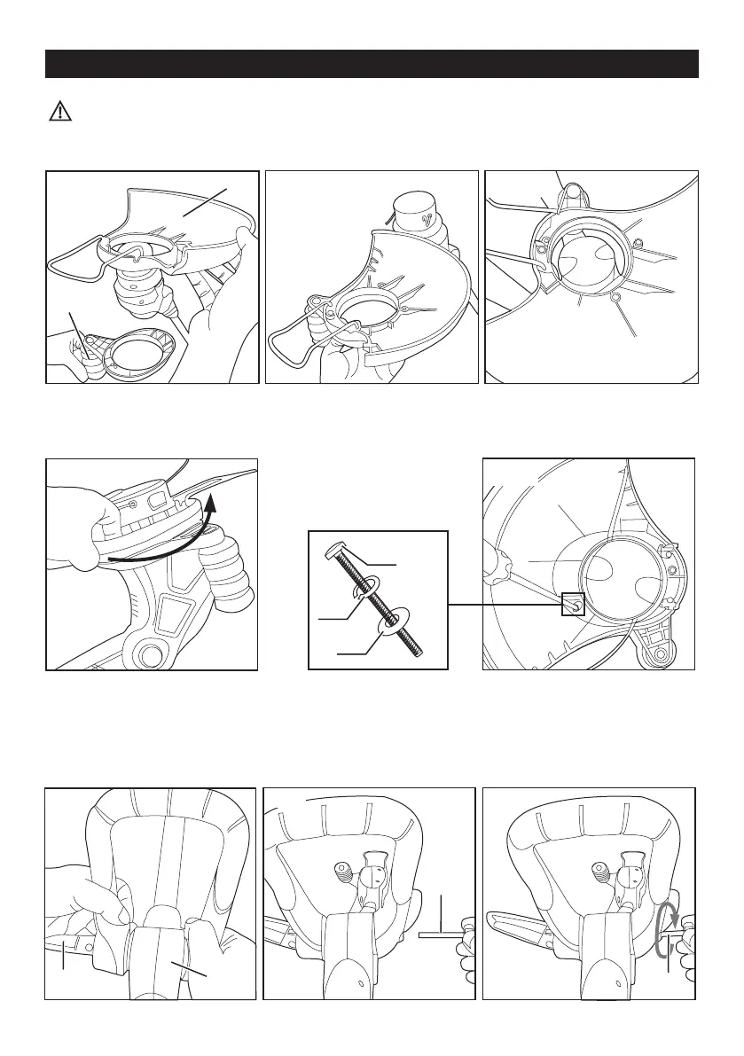3. Align the spigot of the edging support wheel-guard assy with the notch at the trimmer head (11) and place the