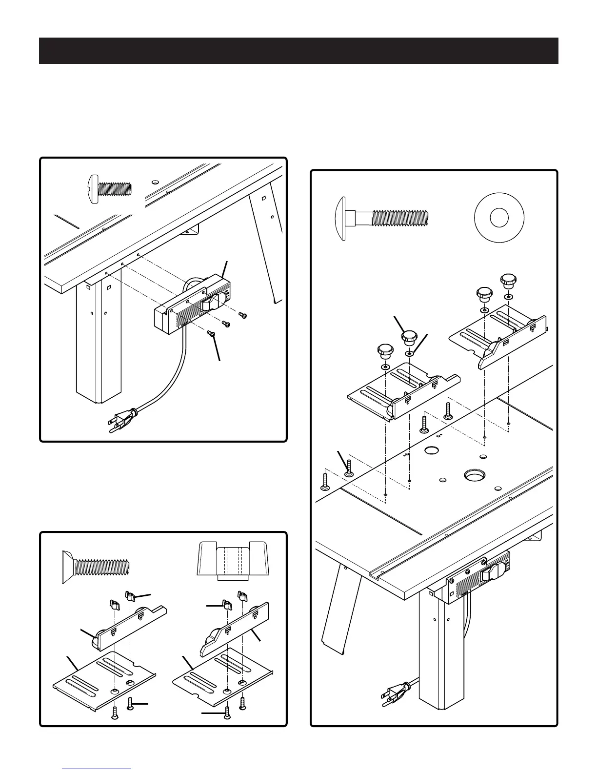 6. Attach left fence assemblies to tabletop using 4 carriage