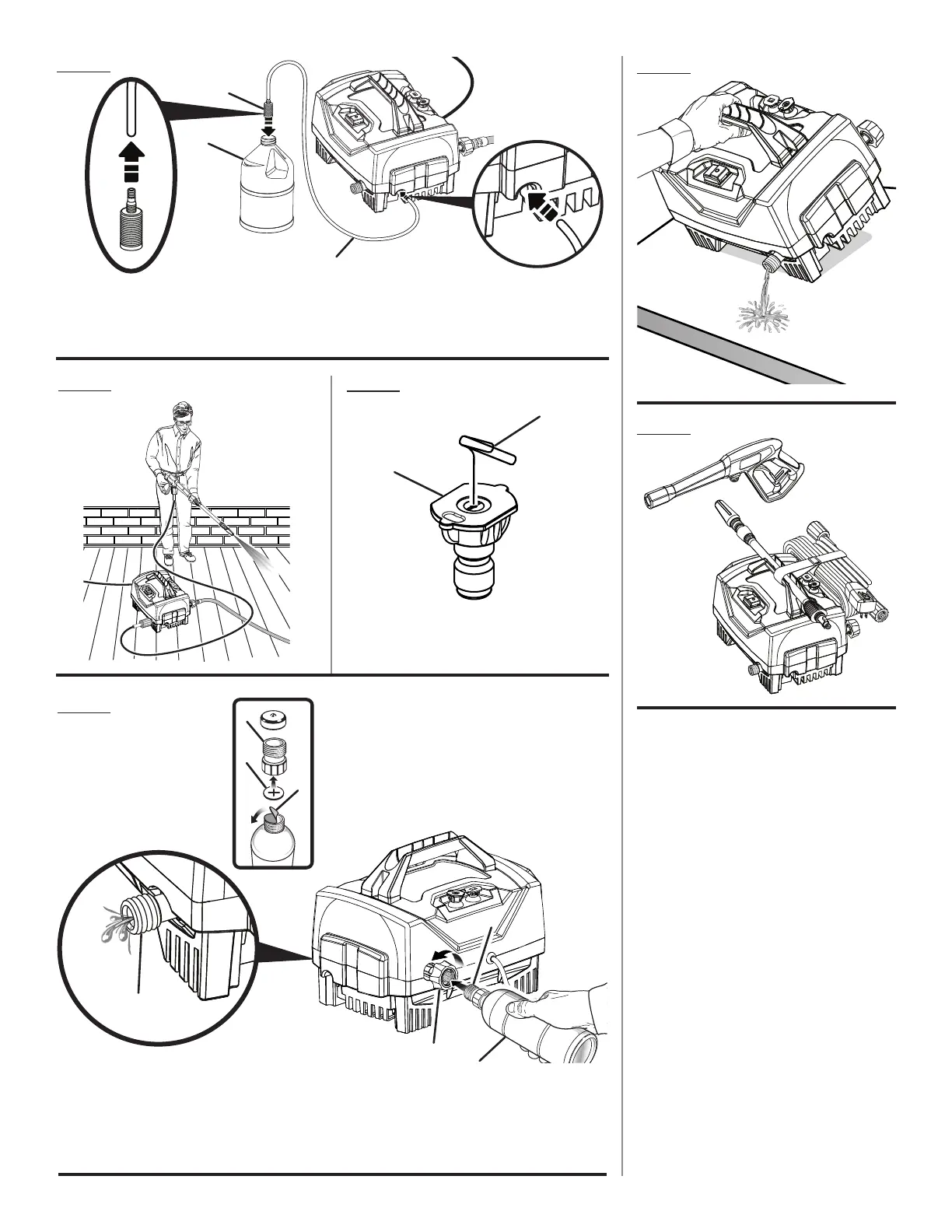 E - Pump outlet (sortie de la pompe, orificio de descarga de la bomba)