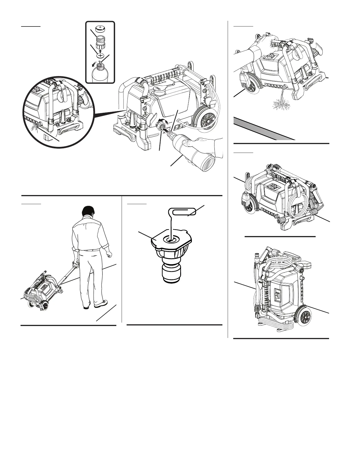 E - Pump outlet (sortie de la pompe, orificio de descarga de la bomba)