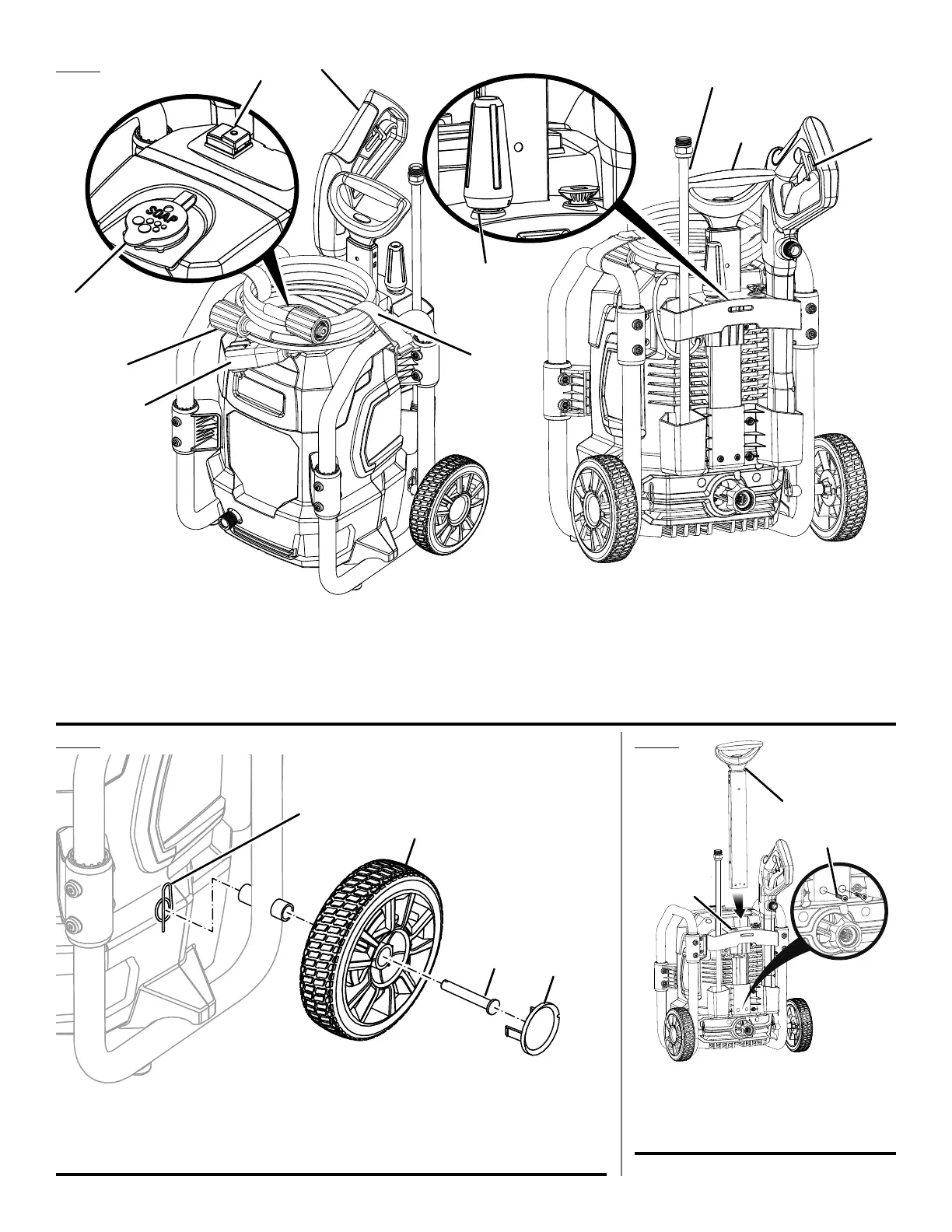 H - High pressure hose (tuyau haute pression, manguera de alta presión)