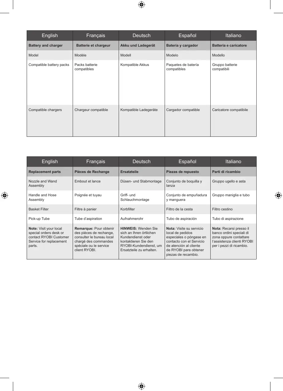 Replacement parts Pièces de Rechange Ersatzteile Piezas de repuesto Parti di ricambio