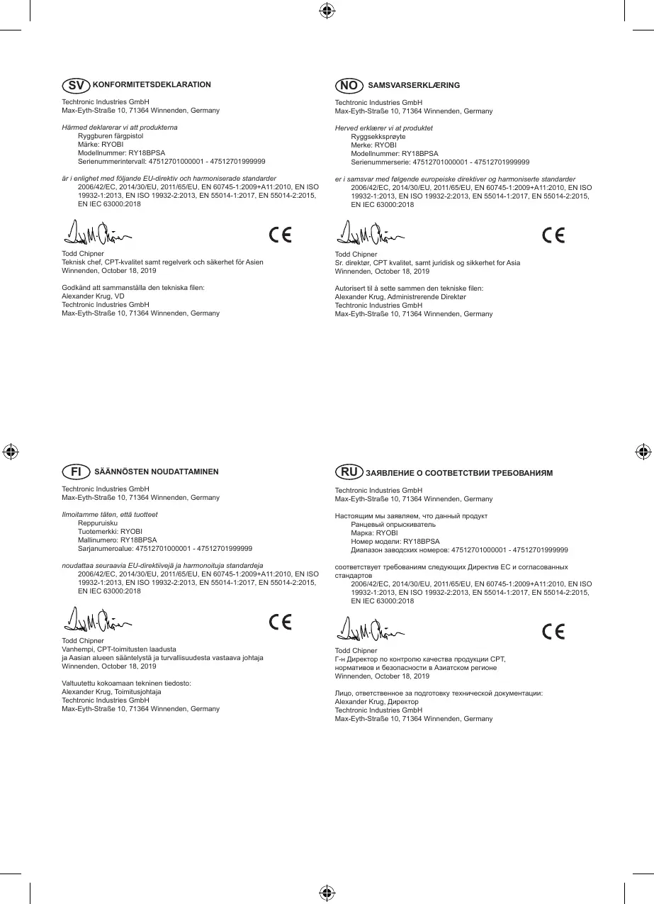2006/42/EC, 2014/30/EU, 2011/65/EU, EN 60745-1:2009+A11:2010, EN ISO