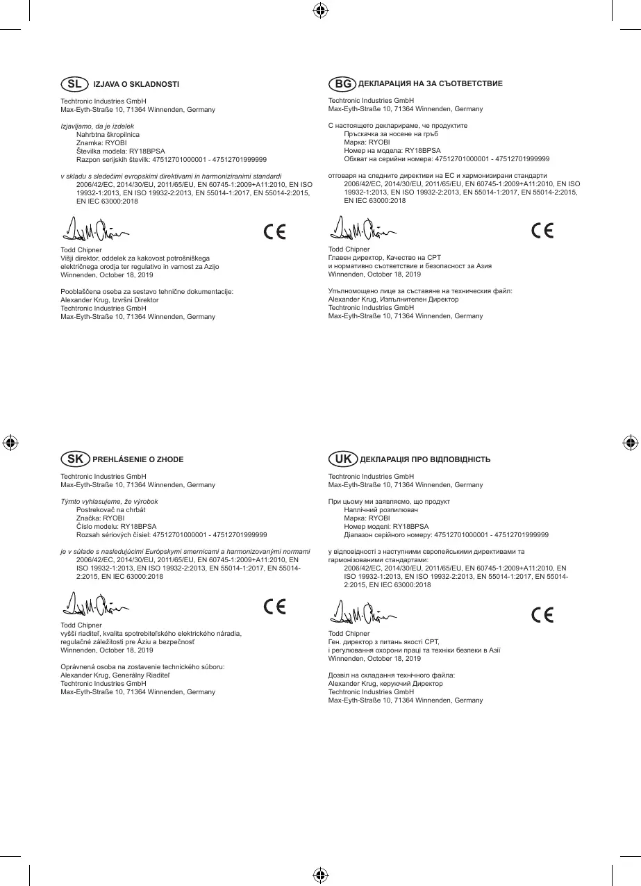 2006/42/EC, 2014/30/EU, 2011/65/EU, EN 60745-1:2009+A11:2010, EN ISO