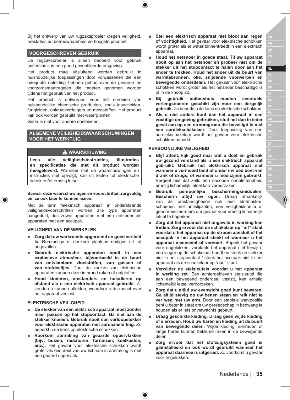 De rugzaksproeier is alleen bedoeld voor gebruik