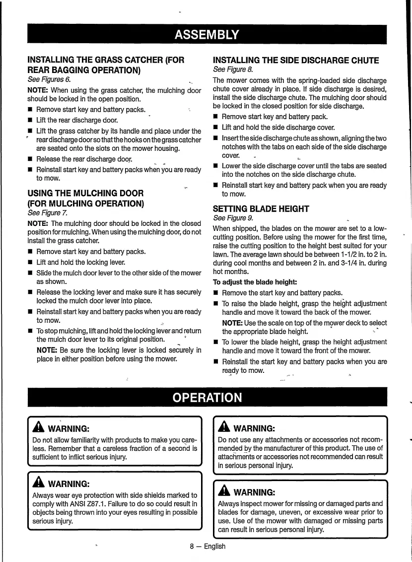 Ryobi RY401021 - Installing Grass Catcher; Using the Mulching Door; Installing Side Discharge Chute; Setting Blade Height