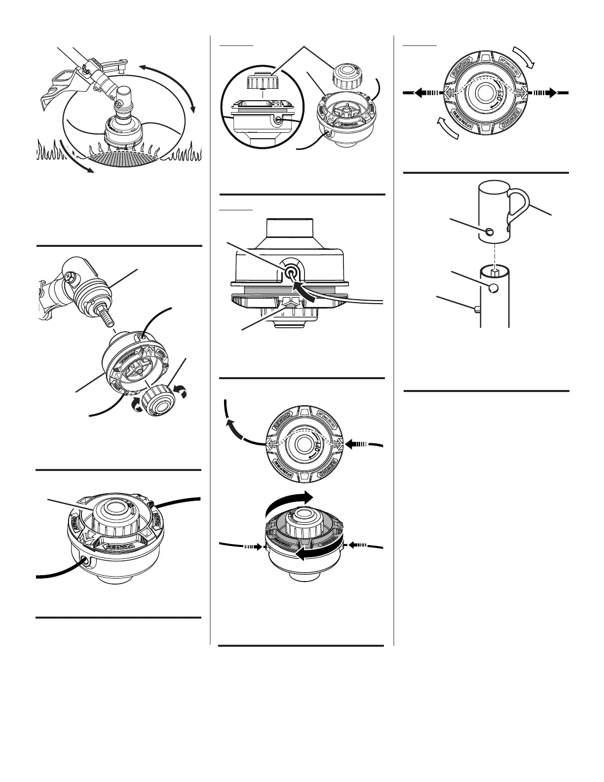 B - string head (tête de coupe, cabezal del hilo)