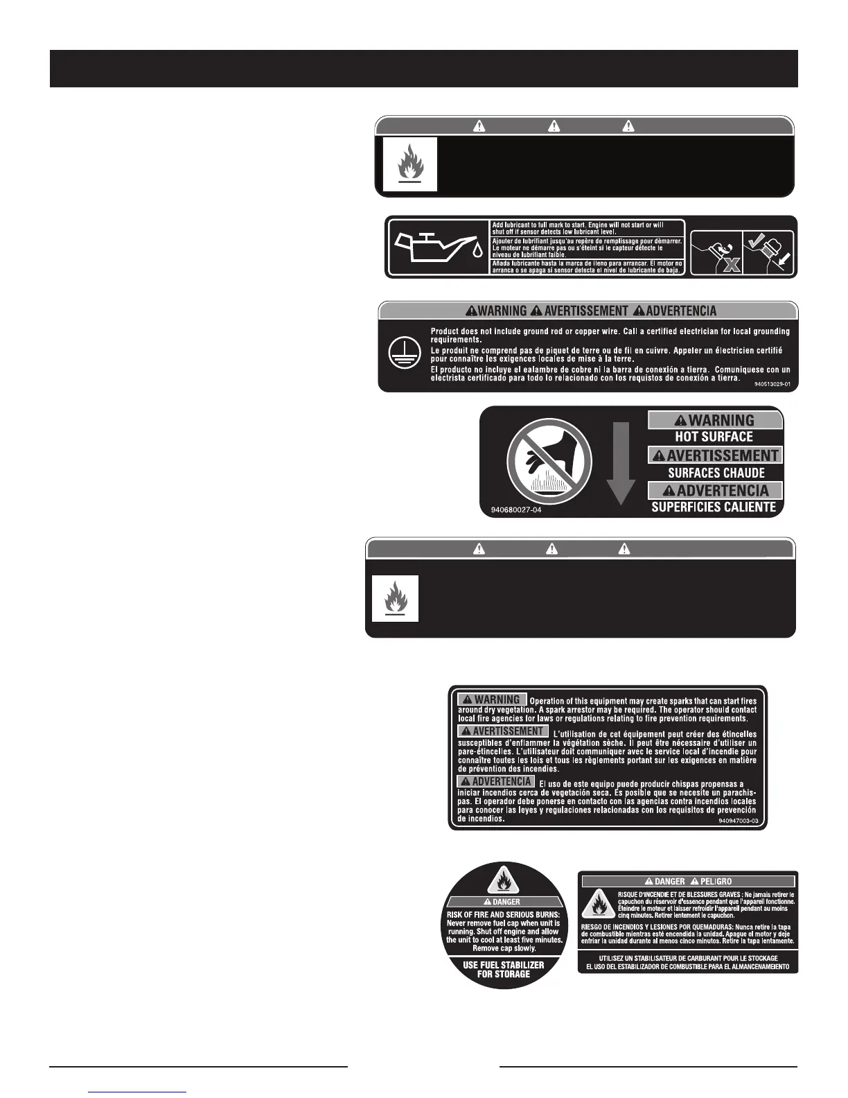 Risk of Fire. Check for any fuel overflow or leaking. Stop the engine before refueling.