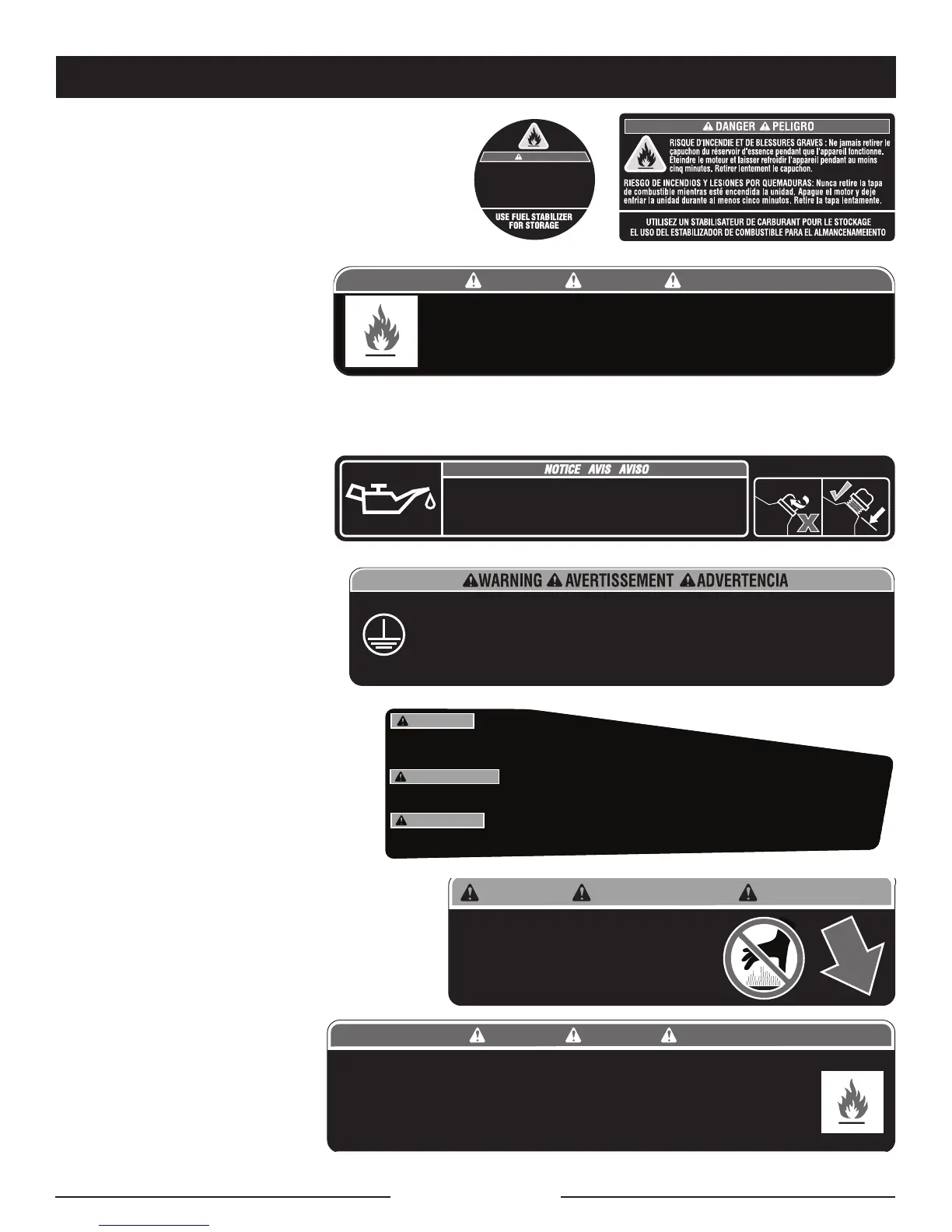 Risk of Fire. Keep all objects at least 3 feet away from this machine. Heat from Muffler and Exhaust gases