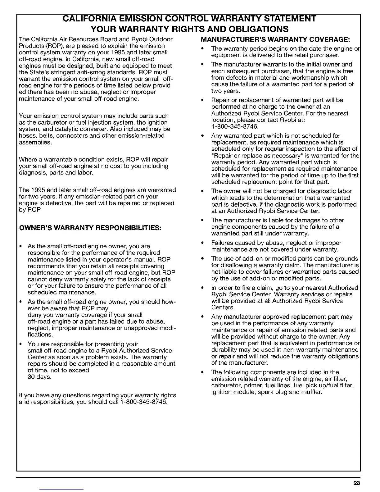 CALIFORNIA EMISSION CONTROL WARRANTY STATEMENT