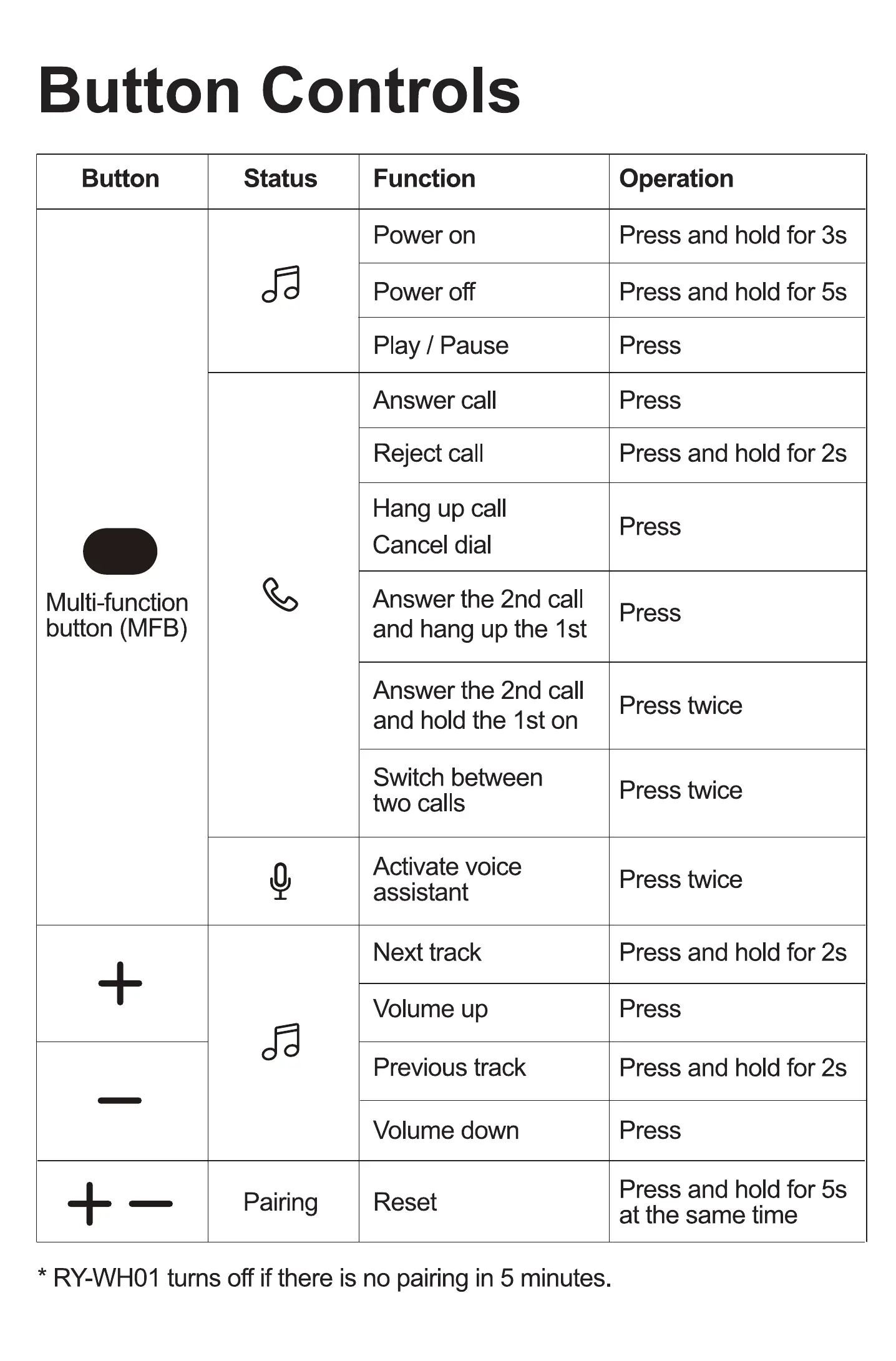 * RY-WHOI turns off if there is no pairing in 5 minutes.