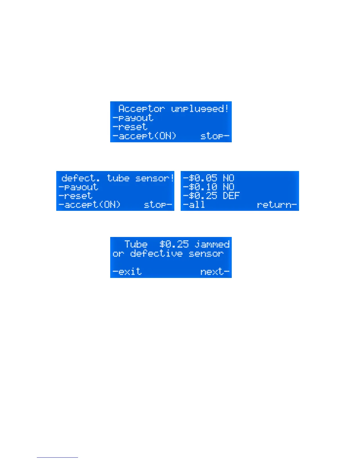 Acceptor unplugged The MDB changer cannot detect its coin ac-