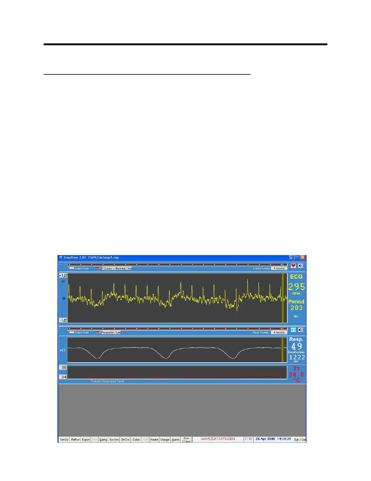 ECG and respiration waveforms along with temperature measurements should appear