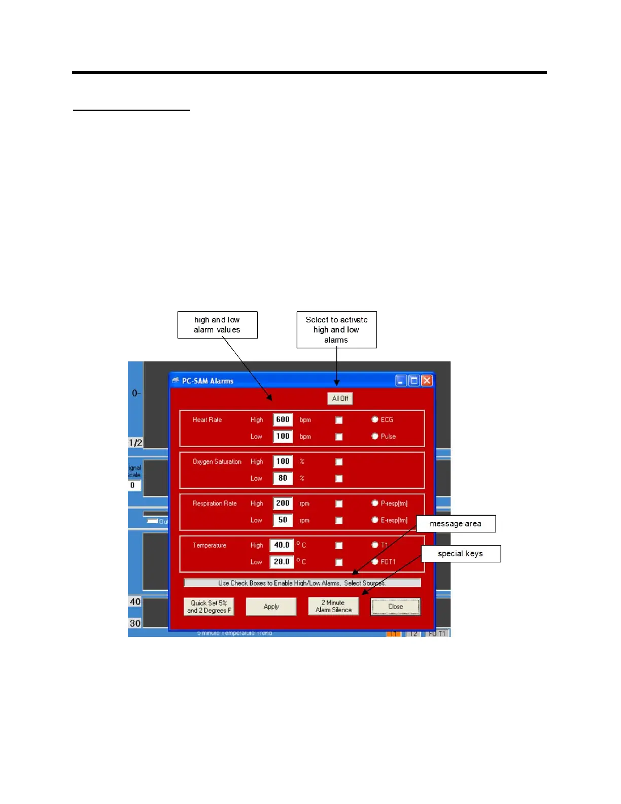 Clicking the Quick Set key sets the high and low alarm limits 5% above and below the