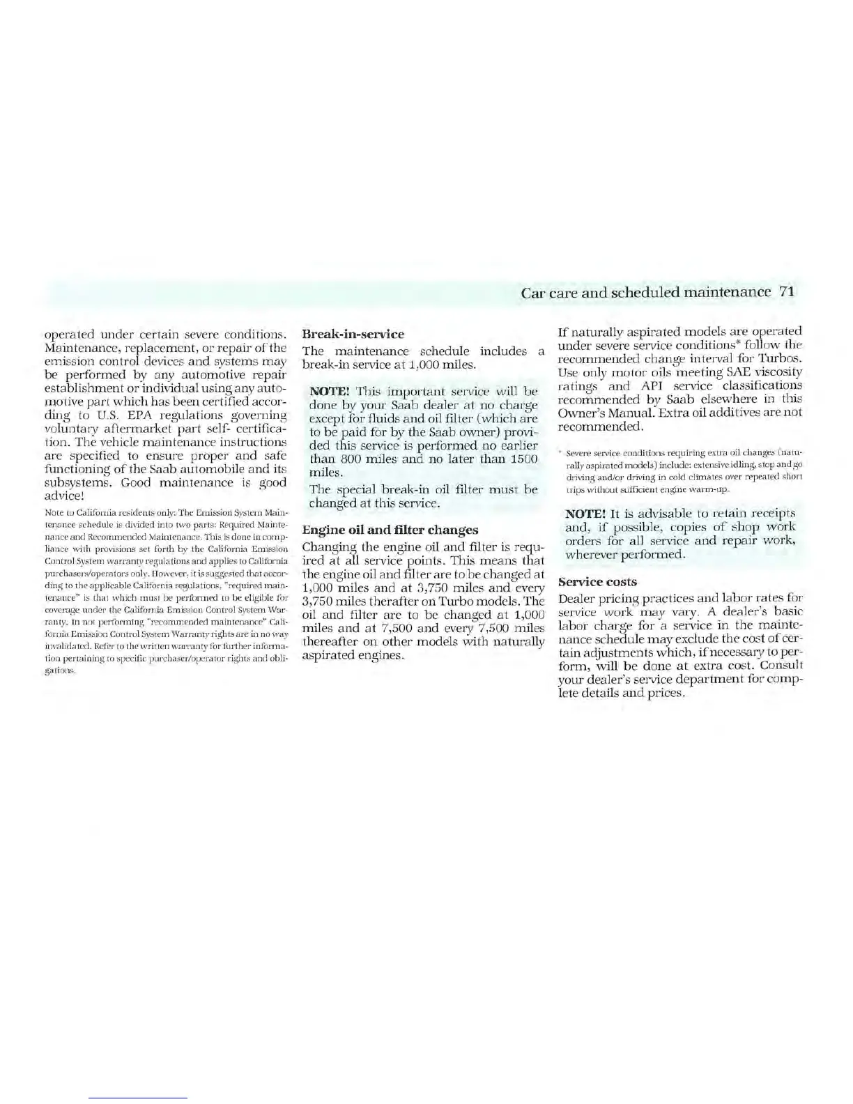 Saab 1987 900 - Break-In Service Requirements; Engine Oil and Filter Change Intervals
