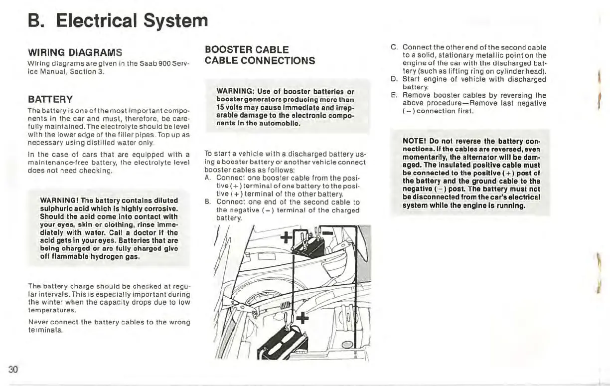Saab 900 1983 - B. Electrical System; Wiring Diagrams; Battery; Booster Cable Cable Connections
