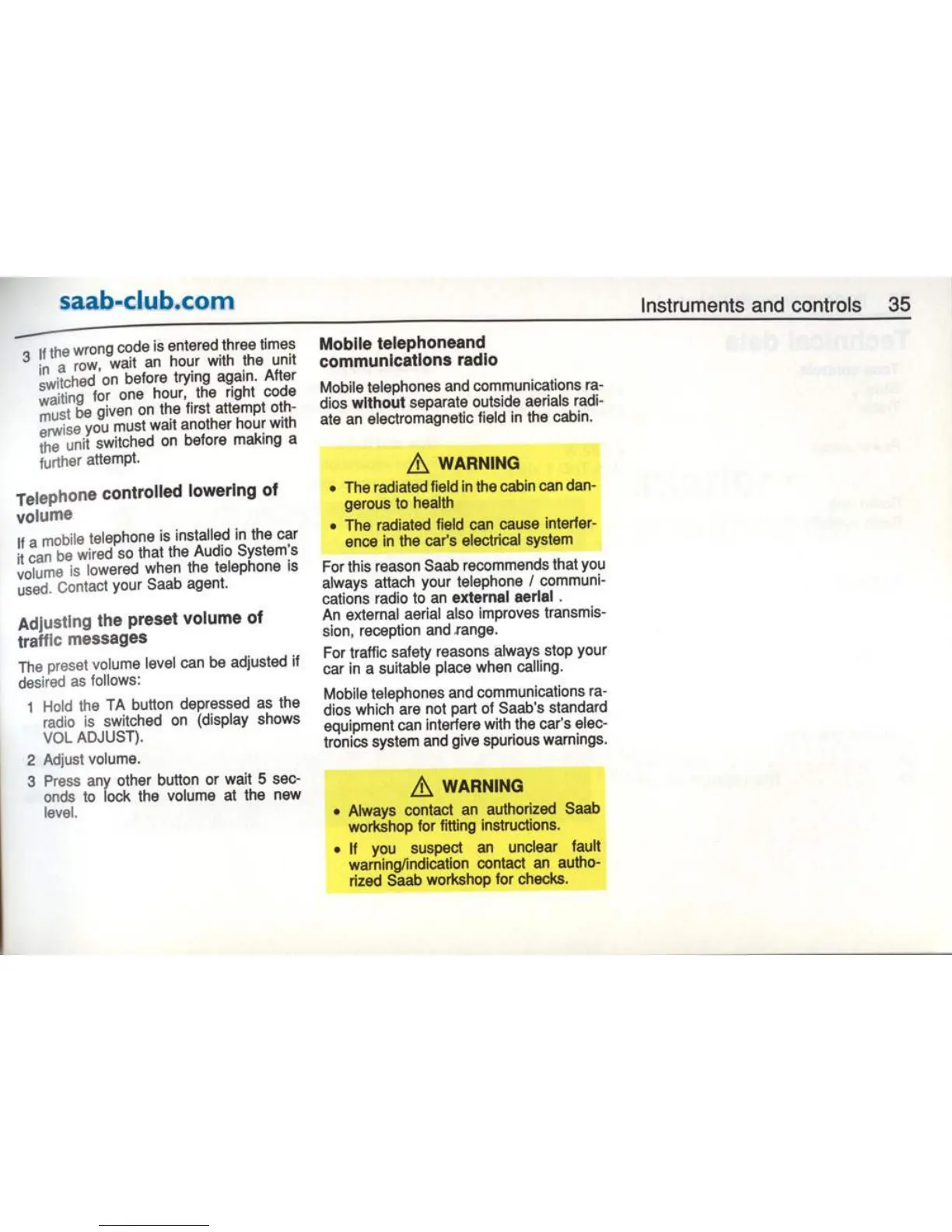 Saab 9000 1995 - Mobile Telephone and Traffic Messages; Telephone Volume and Traffic Message Control; Mobile Phone Safety Warnings
