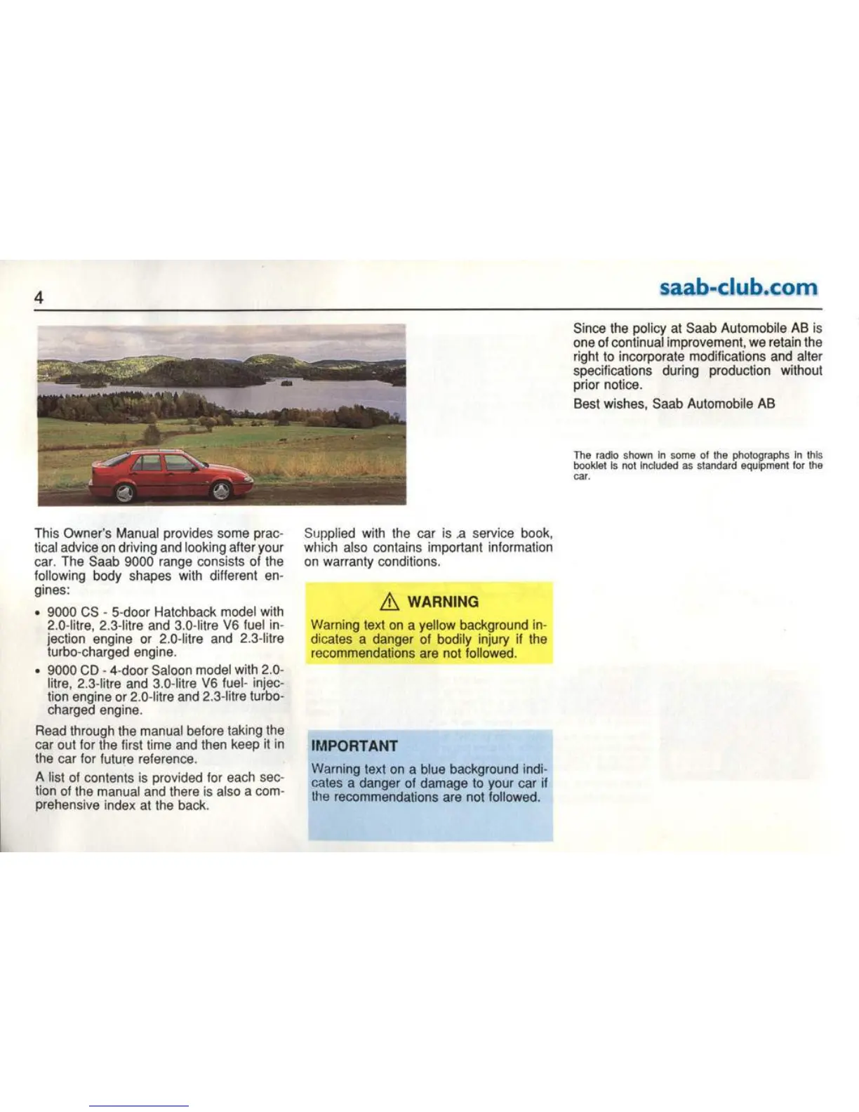 Saab 9000 1995 - Owners Manual Introduction; Yellow Warning Text Explanation; Blue Warning Text Explanation