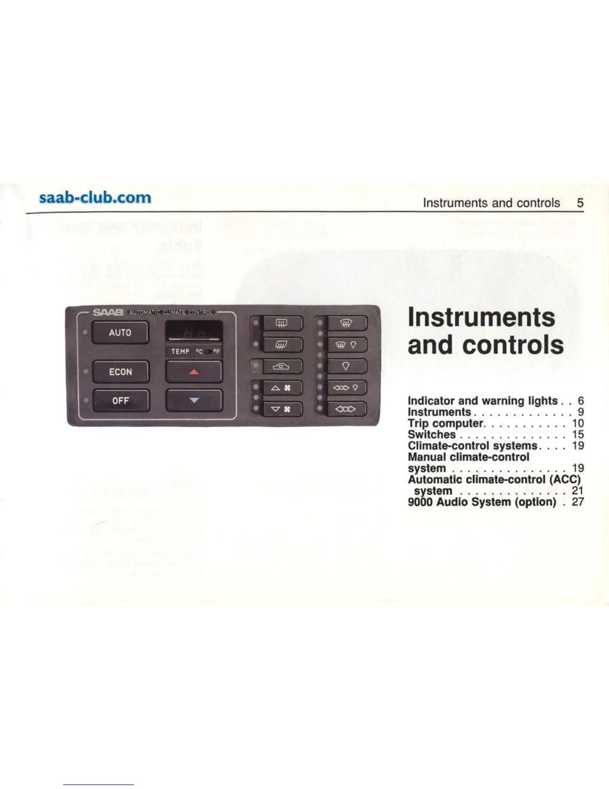 Saab 9000 1995 - Instruments and Controls Overview; Indicator and Warning Lights; Dashboard Instruments; Trip Computer System