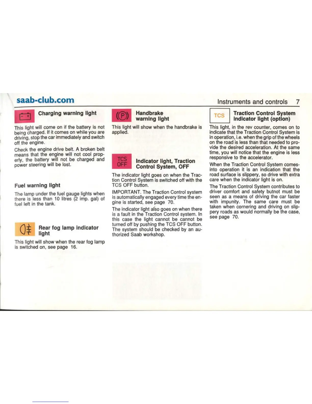 Saab 9000 1995 - Warning Lights and Systems; Charging and Handbrake Warning Lights; Traction Control System Indicator